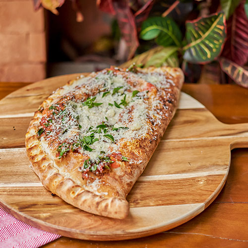 Recheio a base de ricota de búfala, mozzarella e calabresa, regado com molho de tomate e parmesão.
